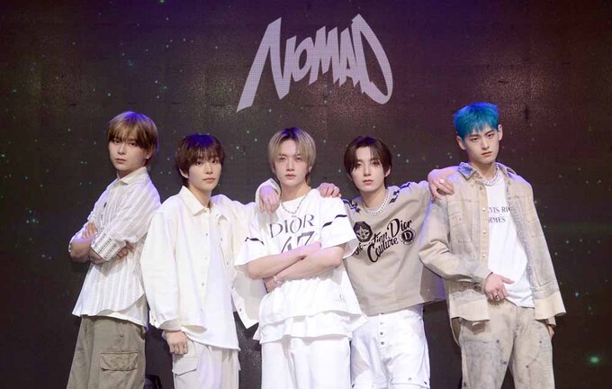 그룹 노매드(도의, 상하, 원, 리버, 준호)가 28일 강남구 성암 아트홀에서 열린 데뷔 EP 'NOMAD' 발매기념 쇼케이스에 참석하고 있다.