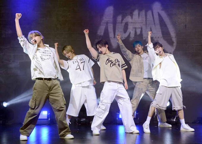 그룹 노매드(도의, 상하, 원, 리버, 준호)가 28일 강남구 성암 아트홀에서 열린 데뷔 EP 'NOMAD' 발매기념 쇼케이스에서 열창하고 있다.