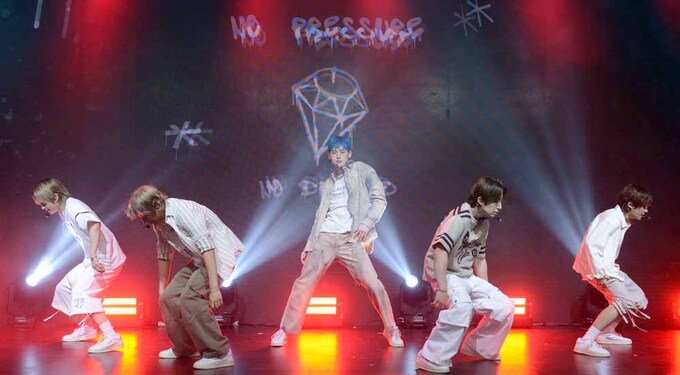 그룹 노매드(도의, 상하, 원, 리버, 준호)가 28일 강남구 성암 아트홀에서 열린 데뷔 EP 'NOMAD' 발매기념 쇼케이스에서 열창하고 있다.