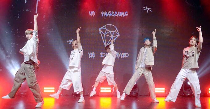 그룹 노매드(도의, 상하, 원, 리버, 준호)가 28일 강남구 성암 아트홀에서 열린 데뷔 EP 'NOMAD' 발매기념 쇼케이스에서 열창하고 있다.