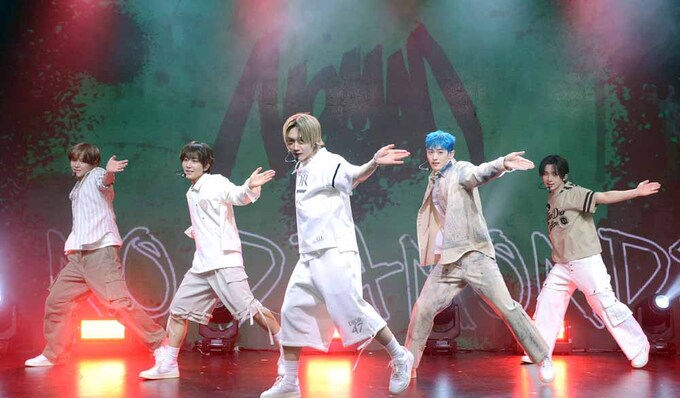 그룹 노매드(도의, 상하, 원, 리버, 준호)가 28일 강남구 성암 아트홀에서 열린 데뷔 EP 'NOMAD' 발매기념 쇼케이스에서 열창하고 있다.