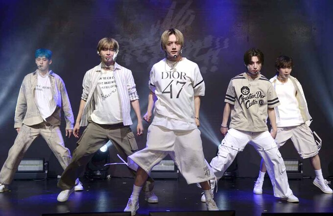 그룹 노매드(도의, 상하, 원, 리버, 준호)가 28일 강남구 성암 아트홀에서 열린 데뷔 EP 'NOMAD' 발매기념 쇼케이스에서 열창하고 있다.