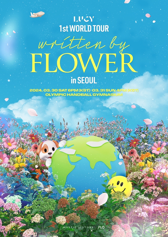 루시(신예찬, 최상엽, 조원상, 신광일)는 오늘(28일) 공식 SNS에 첫 번째 월드투어 'LUCY 1st WORLD TOUR written by FLOWER'(이하 'written by FLOWER', 리튼 바이 플라워)의 서울 공연 포스터를 게재했다. 포스터에는 지구를 둘러싼 꽃들 사이, 희망의 메시지를 전해온 루시와 그런 네 멤버의 곁을 항상 지켜준 왈왈이(공식 팬덤명)들의 모습이 캐릭터로 표현됐다.