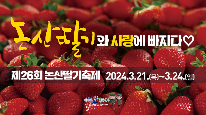 26회를 맞이하는 ‘논산 딸기 축제’는 논산 시민공원 및 시민운동장 일원에서 3월 21일부터 나흘간 개최된다. 논산시는 ‘2027년 논산세계딸기산업엑스포’ 개최를 목표로 국내외 다양한 활동을 진행하고 있다.