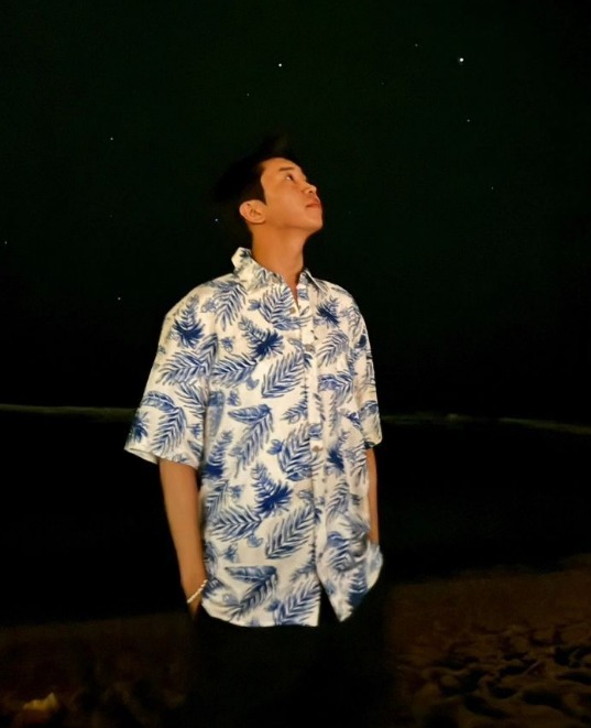 28일 임영웅은 자신의 SNS에 이모티콘 하나를 덧붙이며 두 장의 사진을 공개했다. 사진 속 임영웅은 짧은 반팔에 반바지 차림으로 시야를 가득 메운 별들을 바라보고 있다.