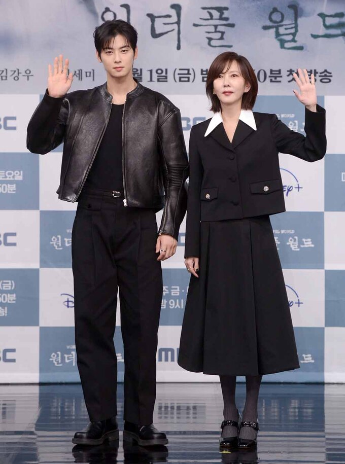 배우 차은우(왼쪽)와 김남주가 29일 상암 MBC 골든마우스홀에서 열린 MBC 금토드라마'원더플 월드' 제작발표회에 참석하고 있다.