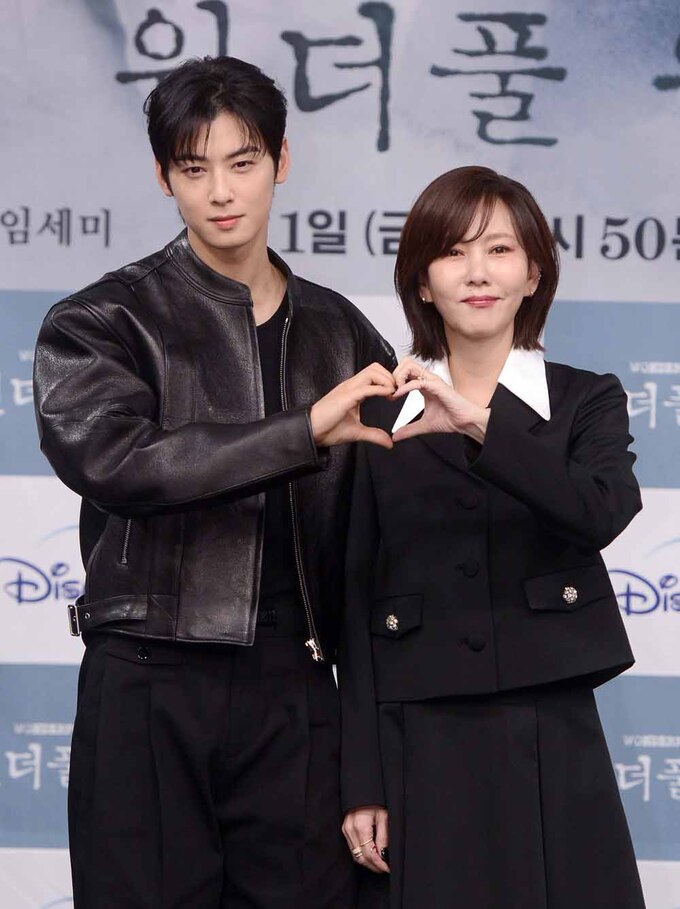 배우 차은우(왼쪽)와 김남주가 29일 상암 MBC 골든마우스홀에서 열린 MBC 금토드라마'원더플 월드' 제작발표회에 참석하고 있다.