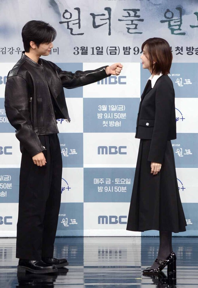 배우 차은우(왼쪽)와 김남주가 29일 상암 MBC 골든마우스홀에서 열린 MBC 금토드라마'원더플 월드' 제작발표회에 참석하고 있다.