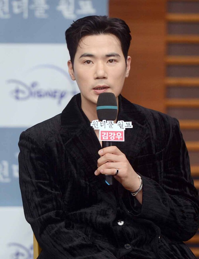 배우 김강우가 29일 상암 MBC 골든마우스홀에서 열린 MBC 금토드라마'원더플 월드' 제작발표회에서 질문에 답하고 있다.
