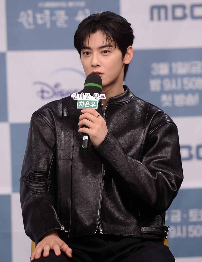 배우 차은우가 29일 상암 MBC 골든마우스홀에서 열린 MBC 금토드라마'원더플 월드' 제작발표회에서 질문에 답하고 있다.