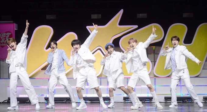 그룹 엔시티 위시 NCT WISH(시온, 유우시, 리쿠, 사쿠야, 료, 재희)가 4일 이태원 블루스퀘어에서 열린 데뷔 싱글 '위시'(WISH)' 발매기념 쇼케이스에서 열창하고 있다.