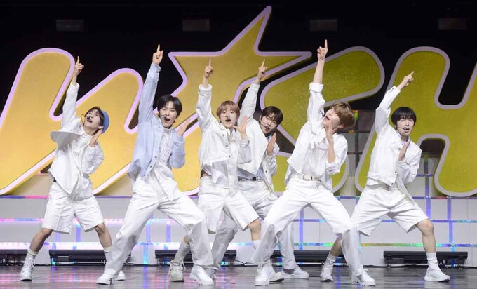 그룹 엔시티 위시 NCT WISH(시온, 유우시, 리쿠, 사쿠야, 료, 재희)가 4일 이태원 블루스퀘어에서 열린 데뷔 싱글 '위시'(WISH)' 발매기념 쇼케이스에서 열창하고 있다.