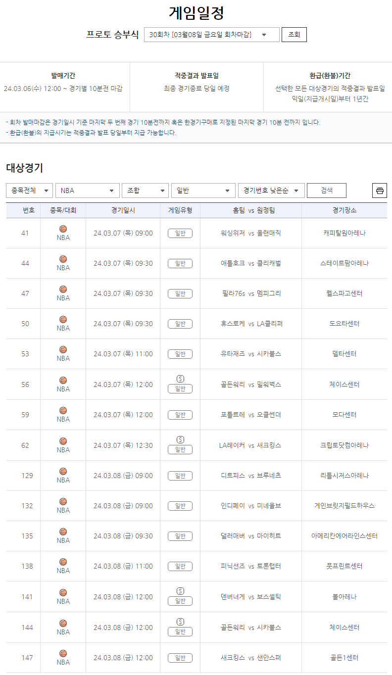 프로토 승부식 30회차 중 NBA를 대상으로 하는 게임은 7일 오전 9시 캐피탈원아레나에서 열리는 워싱턴-올랜도(41~43번)전을 시작으로, 골든스테이트-밀워키(56~58번), LA레이커스-새크라멘토(62~64번), 인디애나-미네소타(132~134번), 댈러스-마이애미(135~137번), 덴버-보스턴(142~144번), 새크라멘토-샌안토니오(147~149번)전 등이 선정됐다.