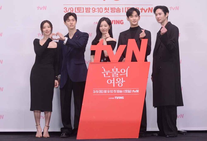 tvN'눈물의 여왕'은 3년 차 부부인 퀸즈그룹 재벌 3세 홍해인과 용두리 이장 아들 백현우의 기적 같은 사랑 이야기로 김수현, 김지원, 박성훈, 곽동연, 이주빈, 김갑수, 이미숙, 정진영 등이 출연한다.