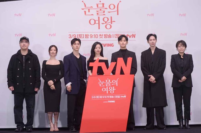 tvN'눈물의 여왕'은 3년 차 부부인 퀸즈그룹 재벌 3세 홍해인과 용두리 이장 아들 백현우의 기적 같은 사랑 이야기로 김수현, 김지원, 박성훈, 곽동연, 이주빈, 김갑수, 이미숙, 정진영 등이 출연한다.