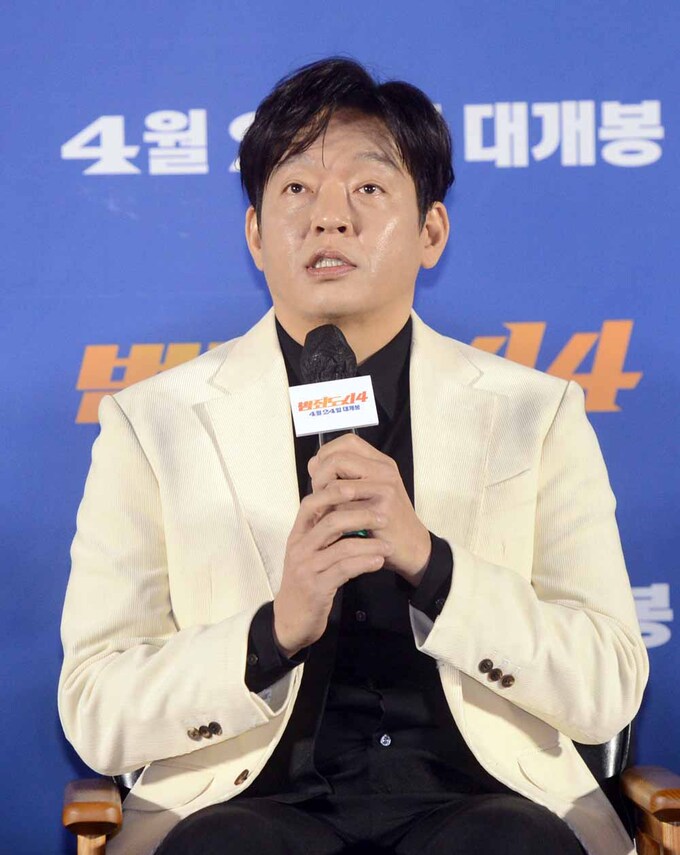배우 박지환이 11일 메가박스 성수점에서 열린 영화'범죄도시4(허명행 감독)' 제작발표회에 참석하고 있다.