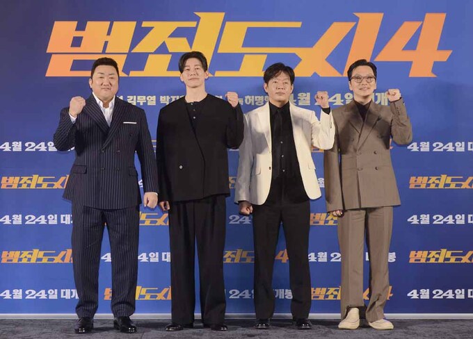 배우 마동석, 김무열, 박지환, 이동휘(왼쪽부터)가 11일 메가박스 성수점에서 열린 영화'범죄도시4(허명행 감독)' 제작발표회에 참석하고 있다.