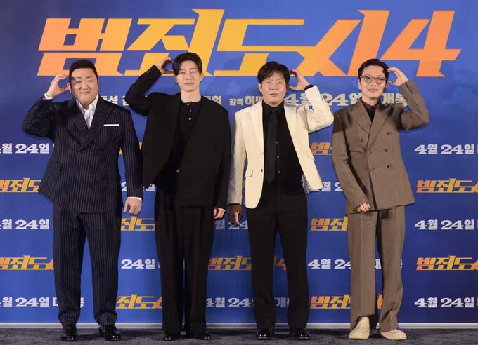 배우 마동석, 김무열, 박지환, 이동휘(왼쪽부터)가 11일 메가박스 성수점에서 열린 영화'범죄도시4(허명행 감독)' 제작발표회에 참석하고 있다.