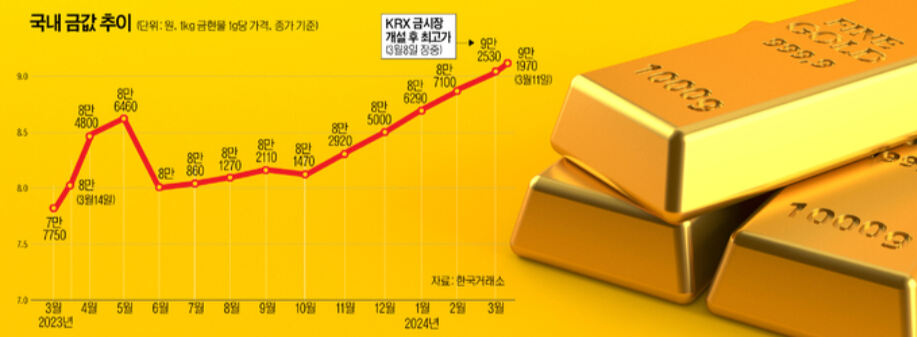 12일 KRX 금시장에서 이날 1㎏짜리 금 현물은 1g당 9만2000원 초반에 거래 중이다. 1㎏짜리 금 현물은 지난 8일 KRX 금시장에서 장 중 1g당 9만2530원까지 올라 2014년 KRX 금시장이 거래를 시작한 이후 최고치를 기록했다. 금 가격은 지난해 중반 8만원 선에서 움직이다가 점차 올라 최근에는 9만원대를 돌파했다.