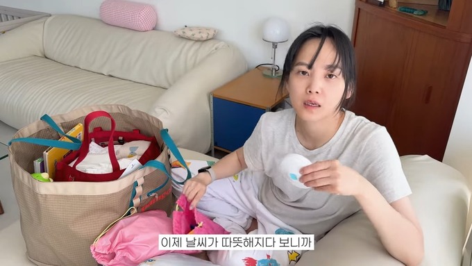 영상 속 윤승아는 “양양에 가는 짐을 싸려고 하는데”라며 여행 아이템을 공개했다. 윤승아는 대부분 아이를 위한 물건으로 이루어진 짐을 공개하며 “제일 중요한 첫 번째 아이템. 장기간 운전을 위한 (전용 운전대)”라며 “새로운 장난감”을 소개했다. 그는 “근데 아직 무서워하고 있어요”라고 덧붙였다.
