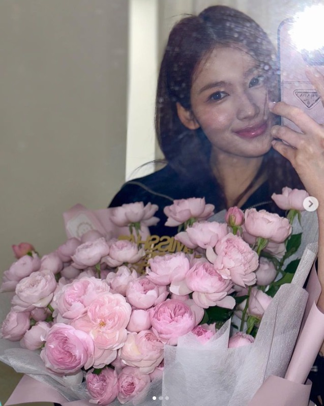 공개된 사진은 그의 거울 셀카. 꽃다발을 든 채 미소를 지으며 포즈를 취한 사나는 화사하면서도 사랑스러운 매력을 자랑해 시선을 모은다.
