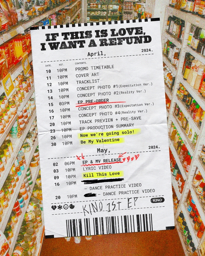 키노의 첫 EP 'If this is love, I want a refund'를 직역하면, '이게 사랑이라고? 그러면 난 환불할래!'라는 뜻이다. 프로모 타임테이블은 앨범명에서 착안, 환불 영수증 콘셉트로 디자인되어 추후 공개될 티징 콘텐츠에도 기대가 모인다.