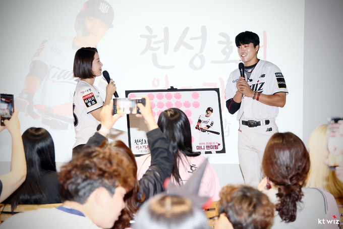 KT는 14일 SSG와의 경기에 앞서 천성호의 미니 팬미팅을 진행했다. 올 시즌 첫 번째 미니 팬미팅의 주인공이 된 것이다. 약 40분간 진행된 팬미팅에는 시즌회원 40명이 참여했다. 팬미팅은 ▲오문오답 ▲퀴즈쇼 ▲단체사진 챌린지 ▲천성호의 아메리카노 선물(참석자 전원) 등 순으로 진행됐다.