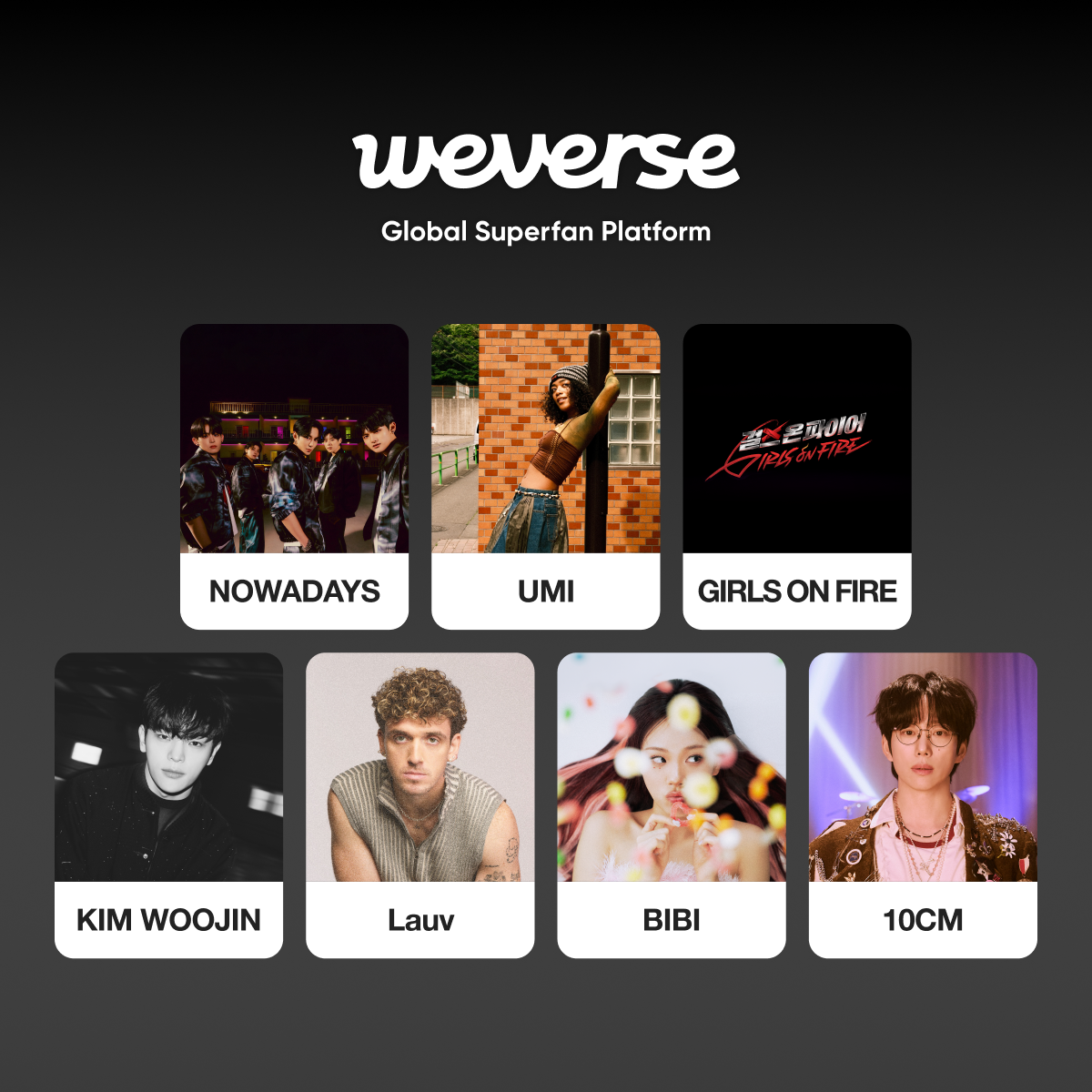 인디계의 대통령이자 페스티벌 강자로 꼽히는 10CM(십센치)의 입점도 주목된다. 10CM는 2010년 어쿠스틱 장르의 ‘아메리카노’를 통해 단숨에 인디 뮤지션에서 대중 음악 스타로 거듭나며 음원차트 단골 손님으로 자리잡았다. 최근 아이돌 그룹과의 협업, 드라마와 영화 OST 발매, 공연 등 다양한 활동을 전개하는 10CM는 오는 25일부터 위버스에서 팬들을 만난다.