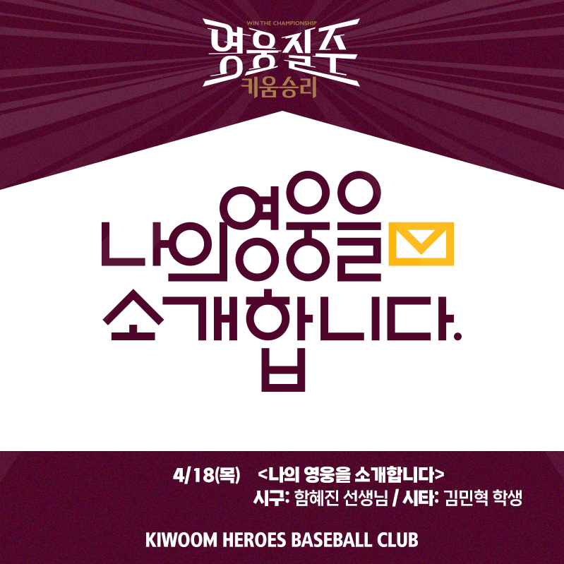 ‘나의 영웅을 소개합니다’는 우리 주변에 키움히어로즈를 열정적으로 응원하고 있는 팬을 소개하는 이벤트다. 사연에 당첨된 팬에게 시구와 시타 기회를 제공하며, 시즌 종료 후 이벤트 당첨자와 선수가 함께하는 행사도 진행한다.