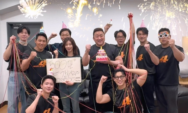 <범죄도시4> 팀은 500만 관객 돌파에 진심 어린 감사를 담은 인사 영상을 공개했다. 마동석, 김무열, 박지환, 이동휘, 이지훈, 김도건, 이주빈, 김신비, 김지훈, 허명행 감독까지<범죄도시4>의 주역들은 극장을 찾아 준 500만 관객들에게 감사함을 담아 직접 작성한 메시지와 함께 “500만 감사합니다!”라는 힘찬 인사를 전했다. 개봉 7일 만에 500만 관객을 돌파한 <범죄도시4>는 오늘(5/1) 근로자의 날 휴일과 5/4(토)부터 본격적으로 시작되는 3일간의 어린이날 황금연휴에도 꺾이지 않는 매서운 흥행 기세를 보여줄 전망이다.