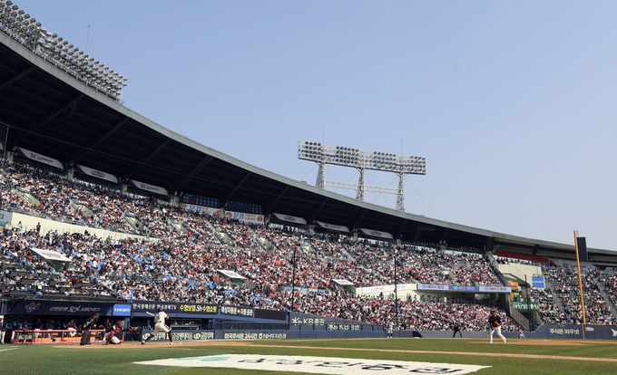 지상파 중계로 인해 다른 게임과 달리 오후 2시에 먼저 플레이볼을 알린 두산-LG의 ‘한 지붕’ 라이벌전이 시작을 알렸다. 준비된 경기 입장권 2만3750장이 일찌감치 동나면서 올 시즌 KBO리그 50번째 매진 경기를 기록했다. LG는 지난달 26일 KIA전부터 이날까지 홈 5경기 연속 매진 포함 올 시즌 7번째 홈 매진을 달성했다.