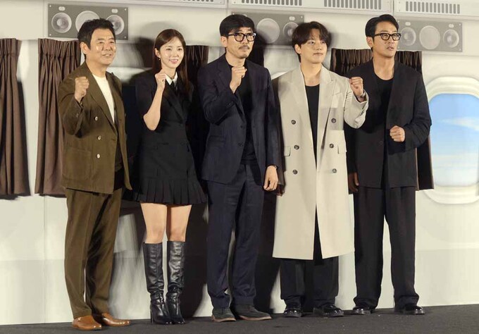 배우 성동일, 채수빈, 김성한 감독, 배우 여진구, 하정우(왼쪽부터)가 22일 용산CGV에서 열린 영화'하이재킹(감독 김성한)제작보고회에 참석하고 있다.