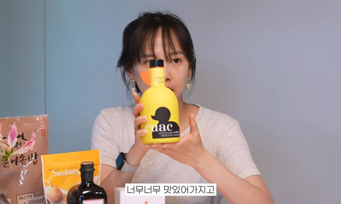 윤승아는 “최근에 꾸악이라는 스페인 브랜드인데 되게 향이 강해요. 향이 강하고 맛도 약간 풀내음이 진짜 강한데 너무너무 맛있어가지고 부라타 치즈 같은 거 먹을 때 소금이랑 뿌려서 먹고 있고”라고 소개했다. 그는 “꾸악이 종류가 되게 여러가지인데 저는 이 노란색, 노란 병아리 같은 이 아이가 제일 제 입맛에 맞더라구요”라고 전했다.