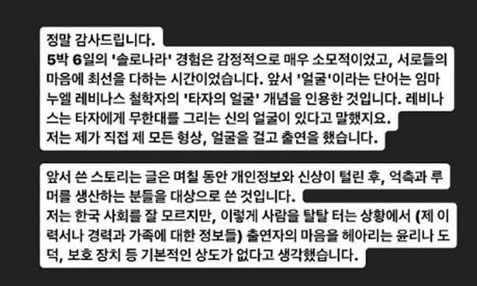 이어 “앞서 쓴 스토리 글은 며칠 동안 개인정보와 신상이 털린 후, 억측과 루머를 생산하는 분들을 대상으로 쓴 것”이라며 “저는 한국 사회를 잘 모르지만 이렇게 사람을 탈탈 터는 상황에서 (제 이력서나 경력과 가족에 대한 정보들) 출연자의 마음을 헤아리는 윤리나 도덕, 보호 장치 등 기본적인 상도가 없다고 생각했다”고 전했다.
