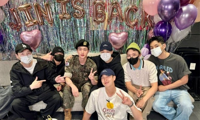 그룹 방탄소년단의 진이 전역했다. 다른 멤버들은 전원 군 복무 중임에도 휴가를 내고 완전체로 진의 전역을 축하했다.