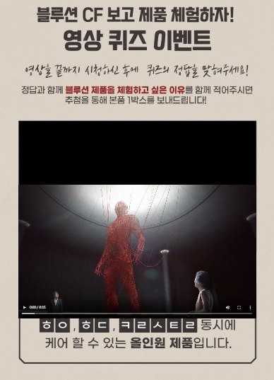 이번 뉴트리코어가 낸 퀴즈 문제는 ‘영상을 끝까지 시청하신 후에 퀴즈의 정답을 맞혀주세요! 정답과 함께 블루션 제품을 체험하고 싶은 이유를 함께 적어주시면 추첨을 통해 본품 1박스를 보내드립니다’였다.