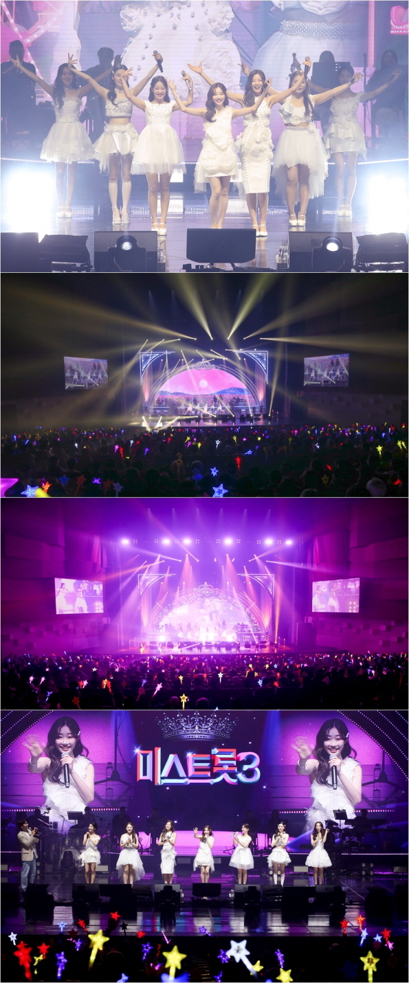 한층 끌어오른 공연장의 뜨거운 열기를 이어갈 무대는 미스트롯3 화제의 출연자 염유리, 송자영, 채윤이 이어갔다. 화제의 출연자들은 방송에서 사랑받은 곡부터 콘서트에서 처음으로 공개하는 무대까지 공연이 지루하지 않도록 자신들의 매력을 마음껏 발산하며 TOP7 멤버들과 공연을 이끌어갔다.