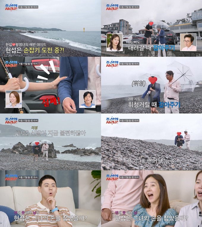 오늘 17일(월) 방송될 TV CHOSUN 순도 100% 리얼 다큐예능 ‘조선의 사랑꾼’에서는 103번째 소개팅 만에 드디어 열애를 시작한 심현섭의 여자친구 ‘울산 왕썸녀’가 드디어 공개된다. 방송에 앞서 제작진이 선보인 선공개 영상에서는 ‘연못남(연애 못해본 남자)’ 심현섭이 해변에서 ‘왕썸녀’의 손잡기에 도전(?)한다. 심현섭은 높은 계단에서 내려오는 그녀의 손을 잡아주려 하지만, 1차 시도에 실패했다. 최성국은 “이땐데, 이때 잡았어야 해”라며 자기 일처럼 안타까워했다.