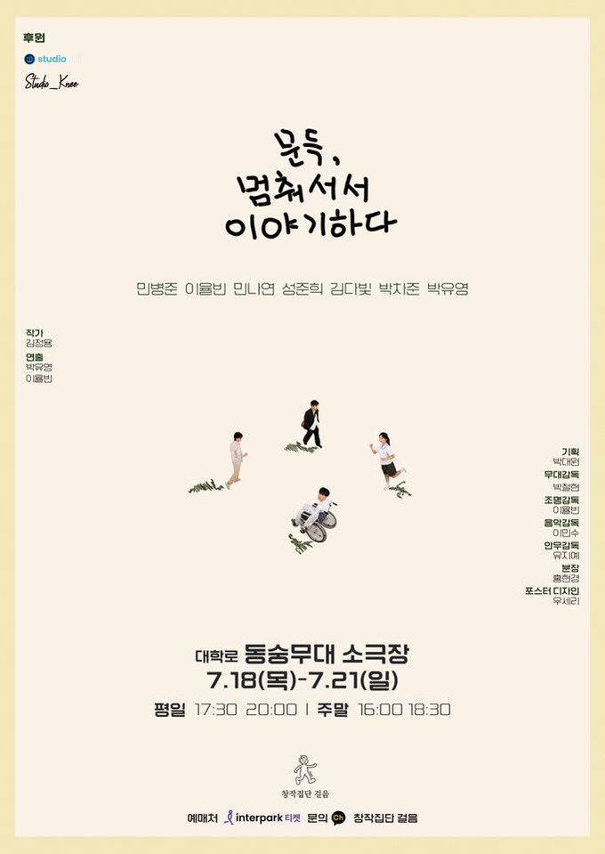 창작집단 걸음은 오는 7월 18일부터 7월 21일까지 대학로 동숭무대 소극장에서 연극 ‘문득, 멈춰서서 이야기하다’가 공연된다고 17일 밝혔다.