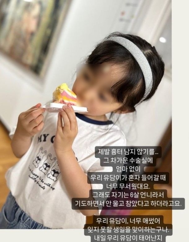 이하정에 따르면, 유담 양은 전날 돌부리에 걸려 넘어져 돌에 이마가 찍히는 부상을 입었다. 이하정은 “유담이 혼자 차디찬 수술실에 들여보내고, 그래도 이만 한 게 다행이라며 아이가 울지 않고 혼자 수술실에 의젓하게 들어가 준 것 만으로도 너무 기특하고 감사했어요”라고 말했다.