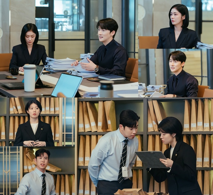 그런 가운데 공개된 사진은 월간회의 중인 ‘이혼팀’ 차은경, 한유리, 정우진(김준한 분), 전은호(표지훈 분)의 모습이 담겨있어 호기심을 자극한다. 새로 주어진 업무를 파악하기에 바쁜 한유리. 아직 모든 게 낯설고 서툰 신입변호사의 로펌 입성기가 궁금해진다. 머리를 맞대고 고객 리스트를 살피는 한유리와 전은호를 유심히 지켜보는 베테랑 변호사 차은경의 포스도 범상치 않다. 그의 냉철한 시선에 바짝 긴장한 신입변호사들의 ‘눈치 만렙’ 모습도 웃음을 자아낸다. 세상 까칠한 차은경과 달리, 부드러운 미소를 건네며 그들과 눈을 맞추는 정우진의 다정함도 눈길을 끈다. 과연 달라도 너무 다른 이혼전문변호사들의 ‘짠내’ 폭발 직장생활은 어떤 모습일지, 상상 초월 이혼 사건을 해결해 나가는 네 변호사의 ‘굿’ 팀플레이를 더욱 기대케 한다.