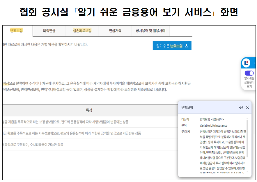 생명보험협회 홈페이지 공시실에 AI를 활용한 '알기 쉬운 금융용어 보기 서비스'를 도입해 금융용어를 쉽게 설명하고 있다.
