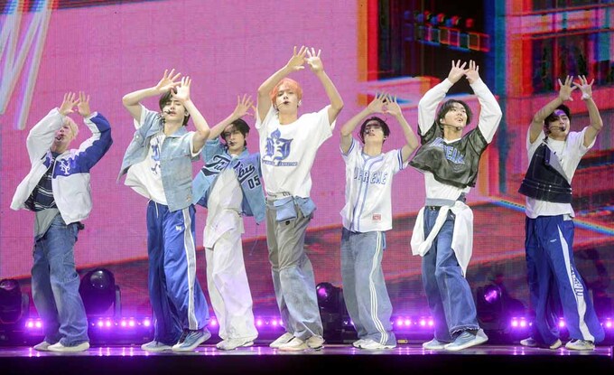 그룹 엔하이픈(정원, 희승, 제이, 제이크, 성훈, 선우, 니키)가 11일 송파구 올림픽공원 핸드볼경기장에서 열린 정규 2집 '로맨스 : 언톨드(ROMANCE : UNTOLD)'발매기념 쇼케이스에서 열창하고 있다.
