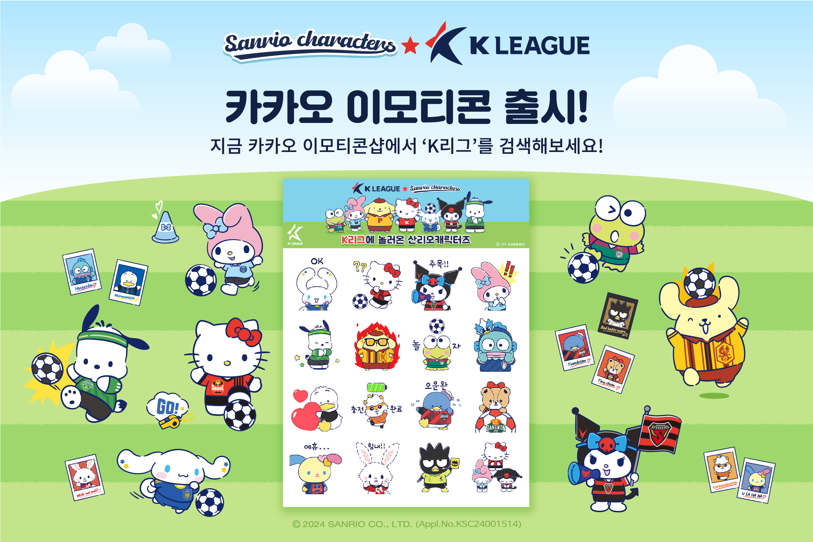 ‘K리그에 놀러온 산리오캐릭터즈’는 K리그 구단 유니폼을 입은 산리오캐릭터즈로 구성되어 있으며, 헬로키티, 마이멜로디, 쿠로미, 시나모롤, 폼폼푸린, 포차코, 한교동 등 15개 캐릭터들이 포함되어 있다.