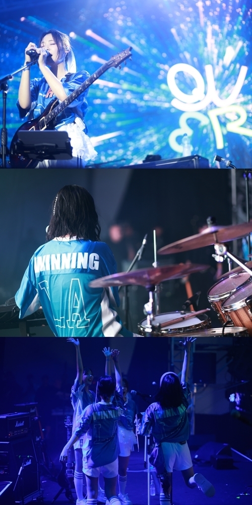 이날 QWER은 보기만 해도 시원한 코발트 블루 톤의 의상으로 등장과 함께 관객들의 뜨거운 환호를 받았다. 이어 QWER은 풋풋한 학창시절 추억을 떠올리게 하는 대표곡 '고민중독'을 시작으로 전속력으로 연주해 지구를 정복하겠다는 메시지를 담은 '지구정복', 경쾌한 밴드 사운드가 인상적인 'Discord', 여름밤을 청량하게 물들이는 '불꽃놀이', QWER만의 서정적인 감성을 녹여낸 '별의 하모니' 무대를 차례로 선보이며 열기를 더해갔다.