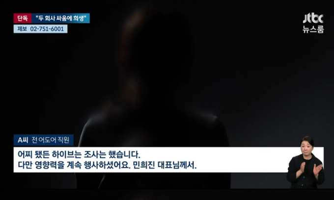 A씨는 이와 관련 JTBC에 “SNS 폭로 직후 민 대표가 연락을 취했지만 ‘당시 오해가 있었다’면서도 사과는 없었다”며 “두 회사의 다툼에 희생양이 됐다. 모든 법적 조치를 검토하고 있다”고 밝혔다.