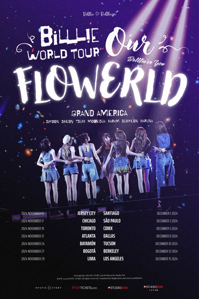 빌리(시윤, 션, 츠키, 문수아, 하람, 수현, 하루나)는 오늘(21일) 공식 SNS 채널에 'Billlie World Tour 'Our FLOWERLD (Belllie've You)' GRAND AMERICA'(이하 'Our FLOWERLD (Belllie've You)')의 포스터를 게재하며, 미주 투어 개최 소식을 전했다.