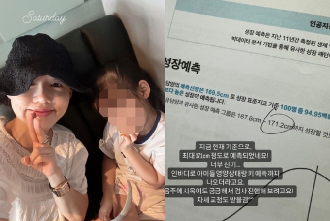 이와 함께 공개된 사진 속에는 딸 유담 양의 성장예측 결과지가 담겼다. 결과에 따르면 유담 양의 예측 신장은 169.5cm로, 171.2cm까지 성장할 것으로 예측됐다. 정준호는 183cm, 이하정은 168cm이다.