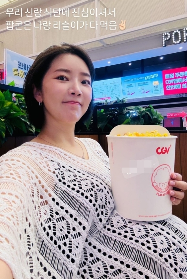 21일 배슬기는 자신의 SNS를 통해 “우리 신랑 식단에 진심이셔서 팝콘은 나랑 리슬이가 다 먹음”이라는 글과 함께 사진 한 장을 게재했다.