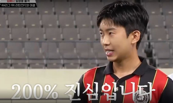김성주는 “우리 임영웅 씨가 이렇게 하고 축구까지 할 수 있냐고 하더라”며 선수들의 열정에 놀란 임영웅의 반응을 전해 웃음을 자아냈다. 임영웅은 이에 쑥스러워하면서 “저도 200% 진심이다”라고 반응했다. 그러자 MC들은 “임영웅 씨가 팀 해체를 걸고 승부에 나선다더라”고 말을 꺼냈다.